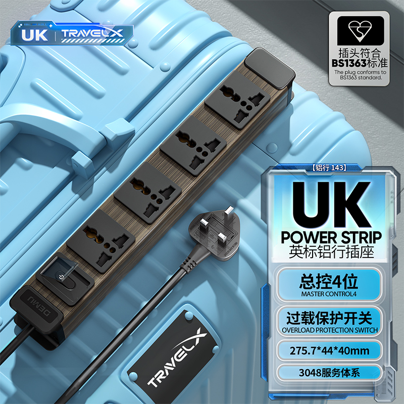 木纹板体 1U非标尺寸:250V 13A输入,4位10A多用孔输出+微光过载总开关+英标插头