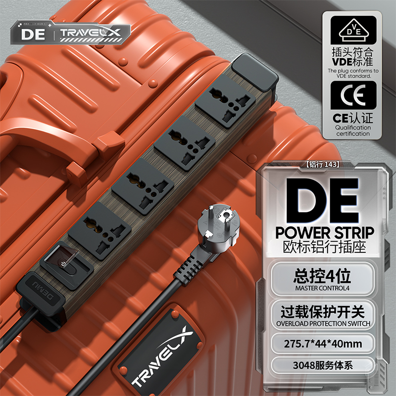 木纹板体 1U非标尺寸:250V 16A输入,4位10A多用孔输出+微光过载总开关+欧标插头