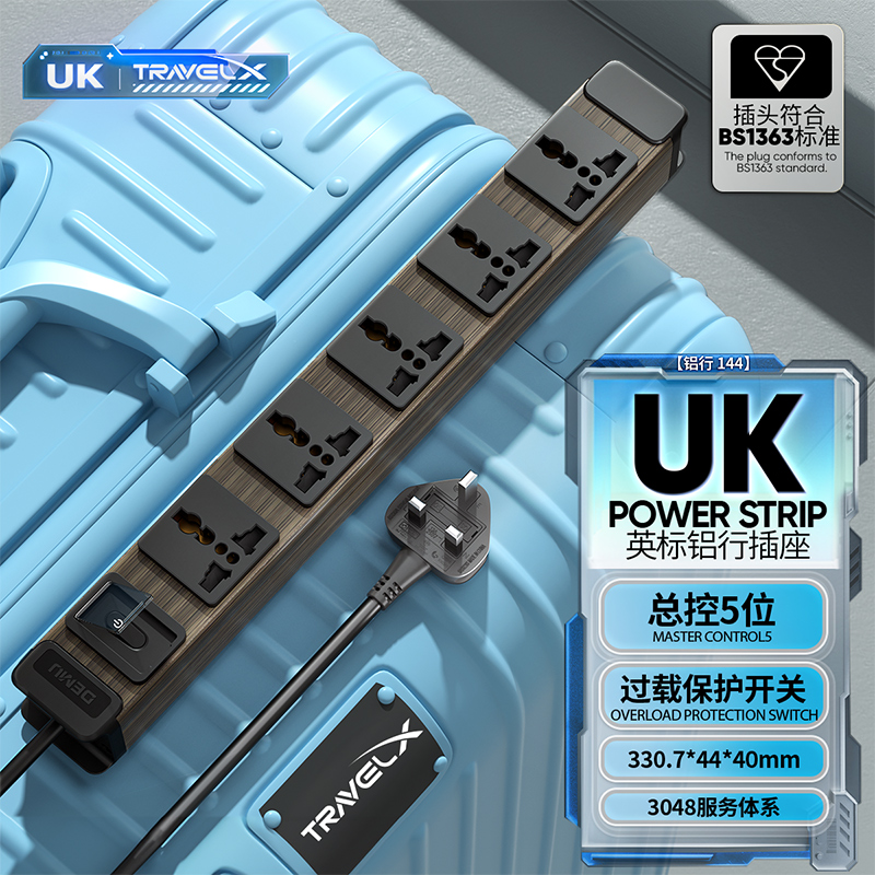 木纹板体 1U非标尺寸:250V 13A输入,5位10A多用孔输出+微光过载总开关+英标插头