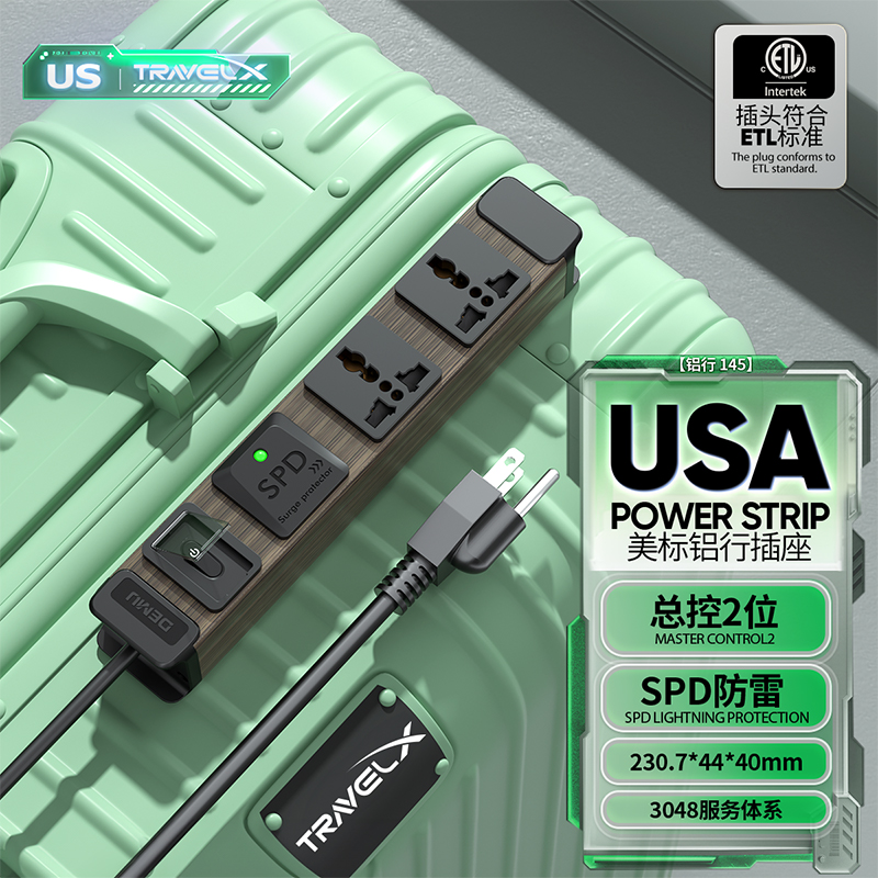 木纹板体 1U非标尺寸:250V 15A输入,2位10A多用孔输出+微光过载总开关+SPD防雷+美标插头