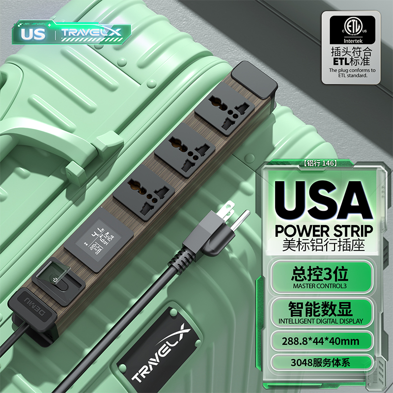 木纹板体 1U非标尺寸:250V 15A输入,3位10A多用孔输出+微光过载总开关+全显计量(白色)+美标插头