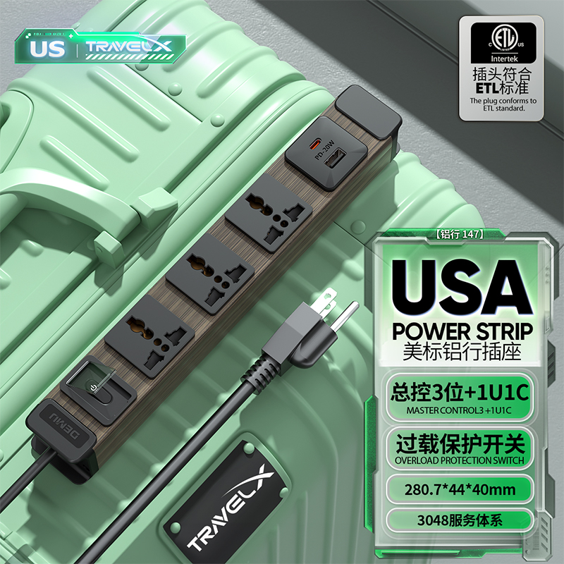 木纹板体 1U非标尺寸:250V 15A输入,3位10A多用孔输出+微光过载总开关+20W1u1c+美标插头