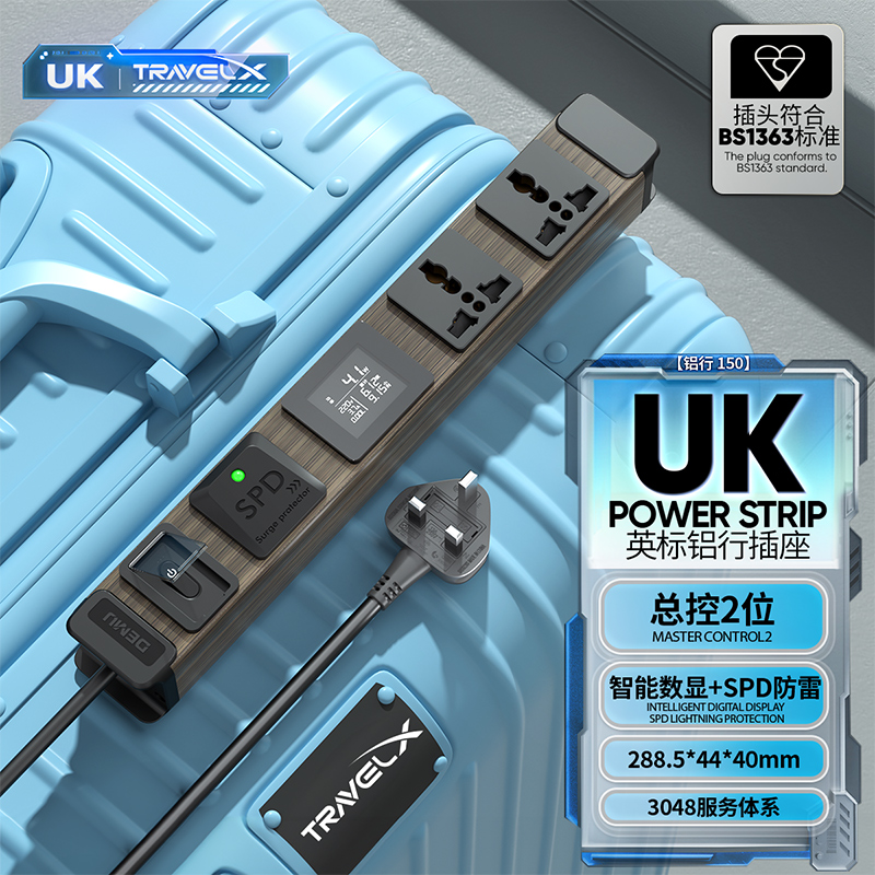 木纹板体 1U非标尺寸:250V 13A输入,2位10A多用孔输出+微光过载总开关+防雷SPD+全显计量(白色)+英标插头