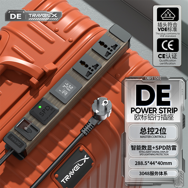 木纹板体 1U非标尺寸:250V 16A输入,2位10A多用孔输出+微光过载总开关+防雷SPD+全显计量(白色)+欧标插头