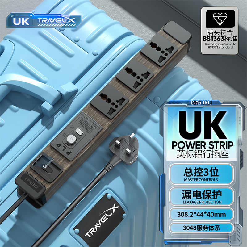 木纹板体 1U非标尺寸:250V 13A输入,3位10A多用孔输出+微光过载总开关+L模块-PLP漏电保护(客供)+英标插头
