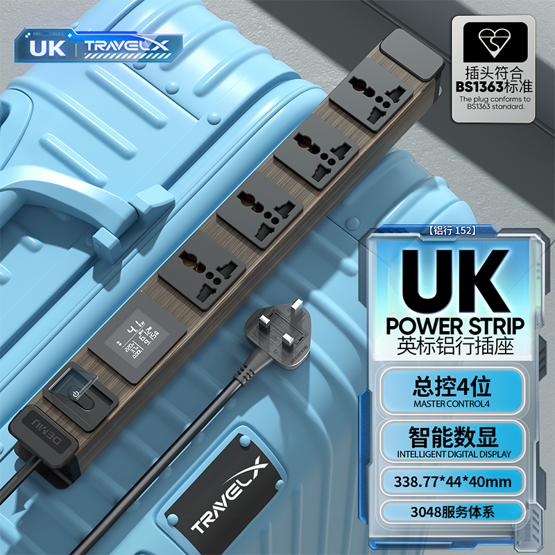 木纹板体 1U非标尺寸:250V 13A输入,4位10A多用孔输出+微光过载总开关+全显计量(白色)+英标插头