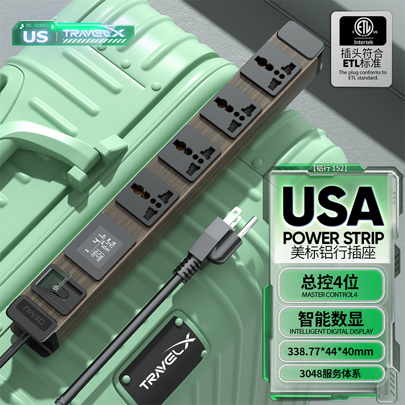 木纹板体 1U非标尺寸:250V 15A输入,4位10A多用孔输出+微光过载总开关+全显计量(白色)+美标插头