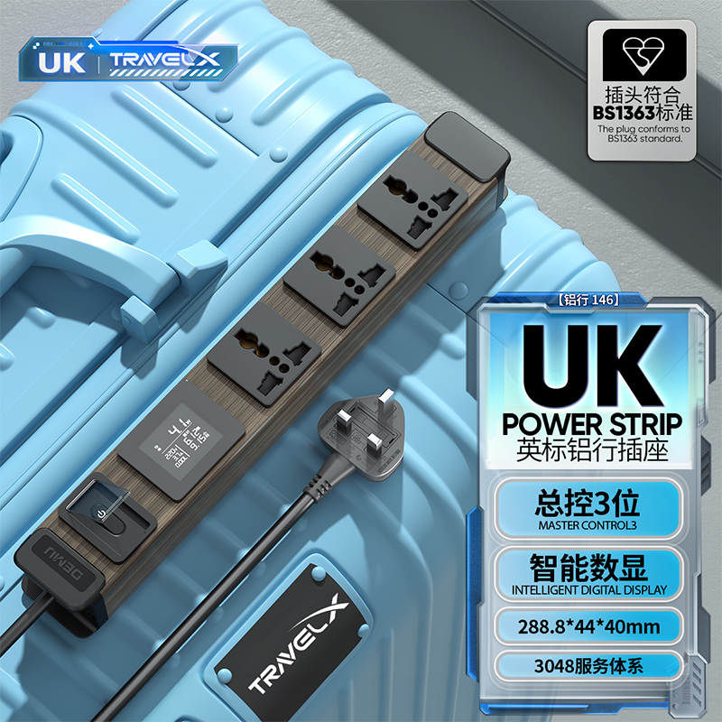 木纹板体 1U非标尺寸:250V 13A输入,3位10A多用孔输出+微光过载总开关+全显计量(白色)+英标插头