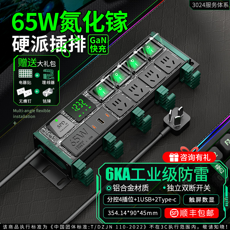 绿色封板绿色开关,2U非标尺寸,左侧进线:250V 10A输入,4位10A国标五孔输出,配置65W(2C1U)+防雷+计量,2米1.5平线+10A国标三脚插头