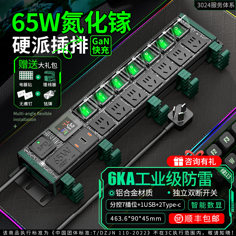 绿色封板绿色开关,2U非标尺寸,左侧进线:250V 10A输入,7位10A国标五孔输出,配置65W(2C1U)+防雷+全显计量,2米1.5平线+10A国标三脚插头