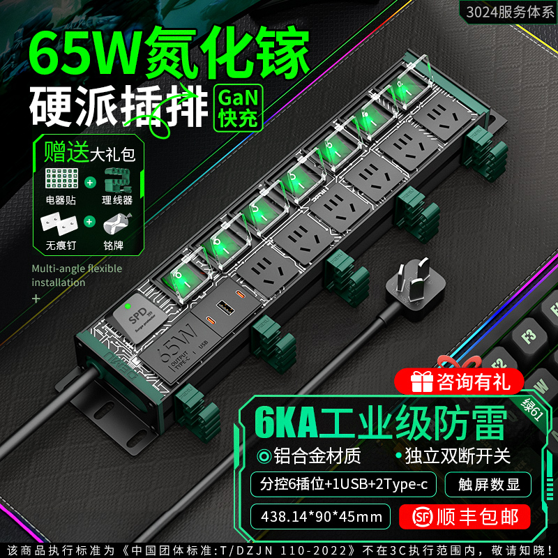绿色封板绿色开关,2U非标尺寸,左侧进线:250V 10A输入,6位10A国标五孔输出,配置防雷+65W(2C1U),2米1.5平线+10A国标三脚插头