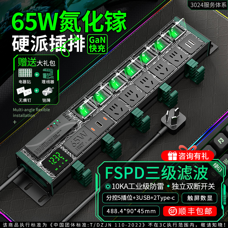 绿色封板绿色开关,2U非标尺寸,左侧进线:250V 10A输入,5位10A国标五孔输出,配置滤波+65W(2C1U)+计量+2USB,2米1.5平线+10A国标三脚插头
