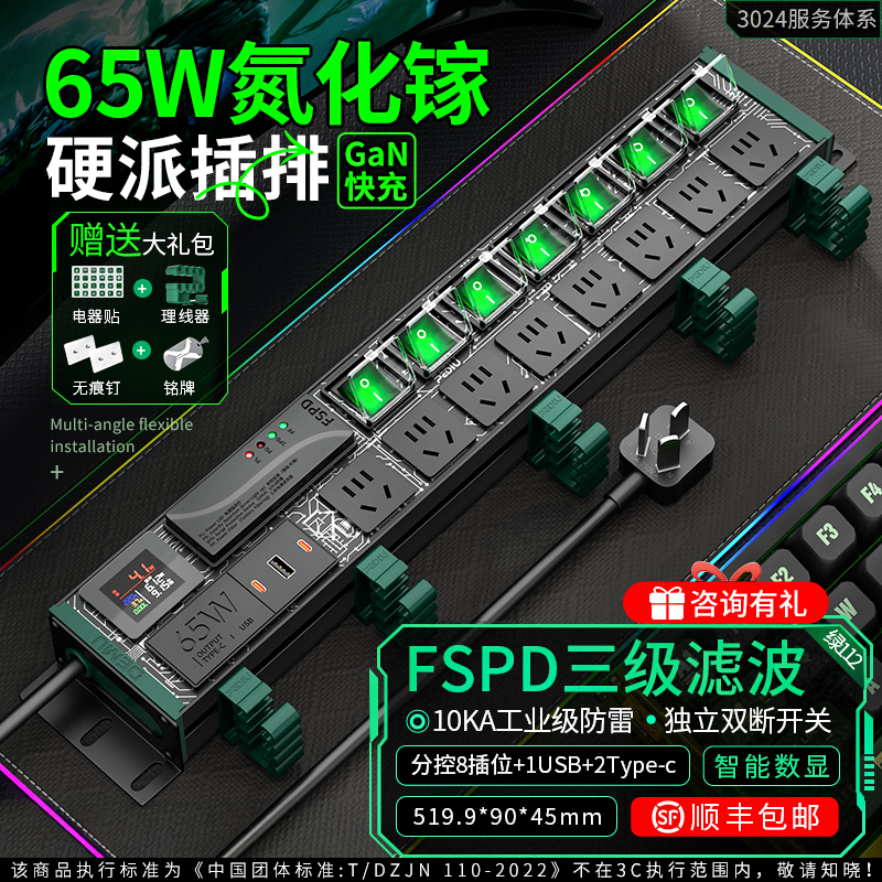 绿色封板绿色开关,2U非标尺寸,左侧进线:250V 10A输入,8位10A国标五孔输出,配置65W(2C1U)+滤波+全显计量,2米1.5平线+10A国标三脚插头