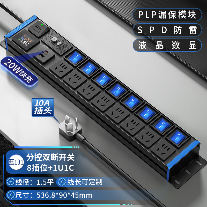 2U非标尺寸,蓝色封板蓝色开关,左进线:250V 10A输入,8位10A新国标扁五孔,SPD防雷+全显计量(彩色