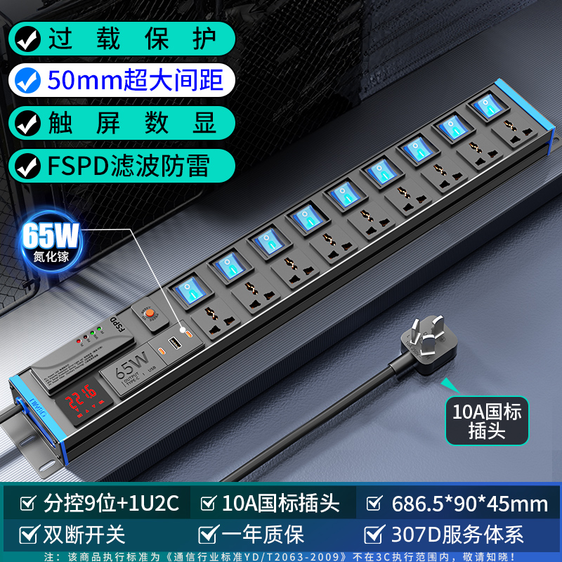 蓝色封板蓝色开关,2U非标尺寸:250V 10A输入,9位10A多用孔+9位蓝色双断开关,配置F滤波模块+计量+1位65W模块,2米1.5平线+10A国标三脚插头