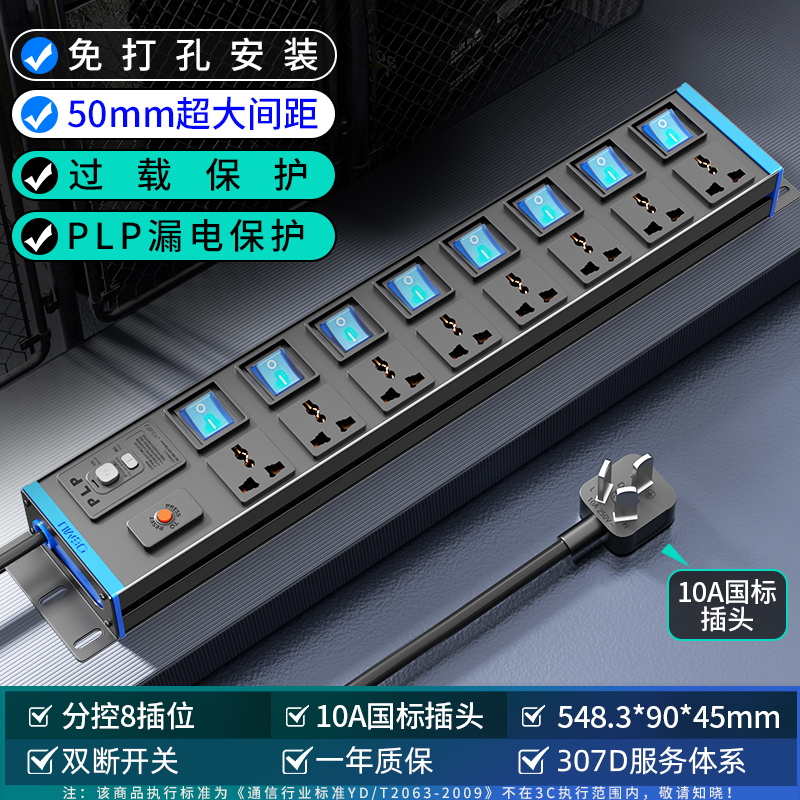 蓝色封板蓝色开关,2U非标尺寸:250V 10A输入,8位10A多用孔+8位蓝色双断开关,配置PLP模块+过载模块,2米1.5平线+10A国标三脚插头