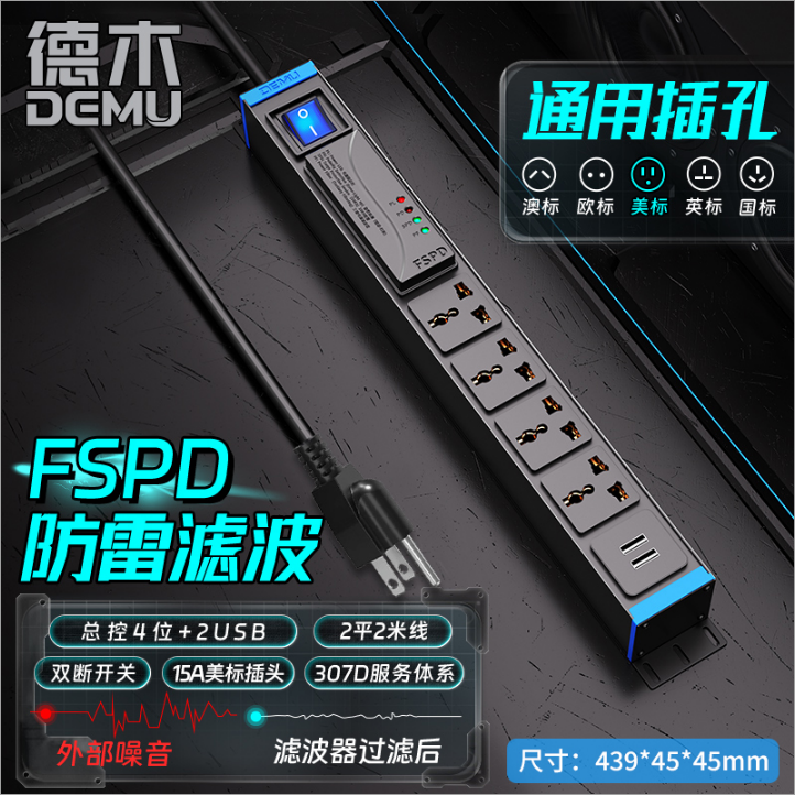 蓝色封板蓝色开关,1U非标尺寸:110V 10A输入,4位10A多用孔+1位2USB,配置F滤波模块+1位总控蓝色开关,2米2平+15A美标插头