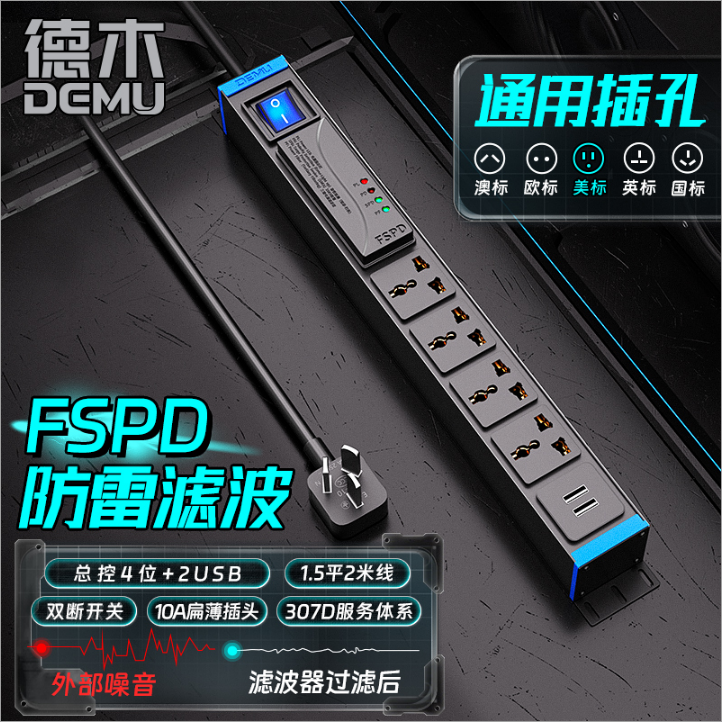 蓝色封板蓝色开关,1U非标尺寸:250V 10A输入,4位10A多用孔+1位2USB,配置F滤波模块+1位总控蓝色开关,2米1.5平线+10A国标三脚插头
