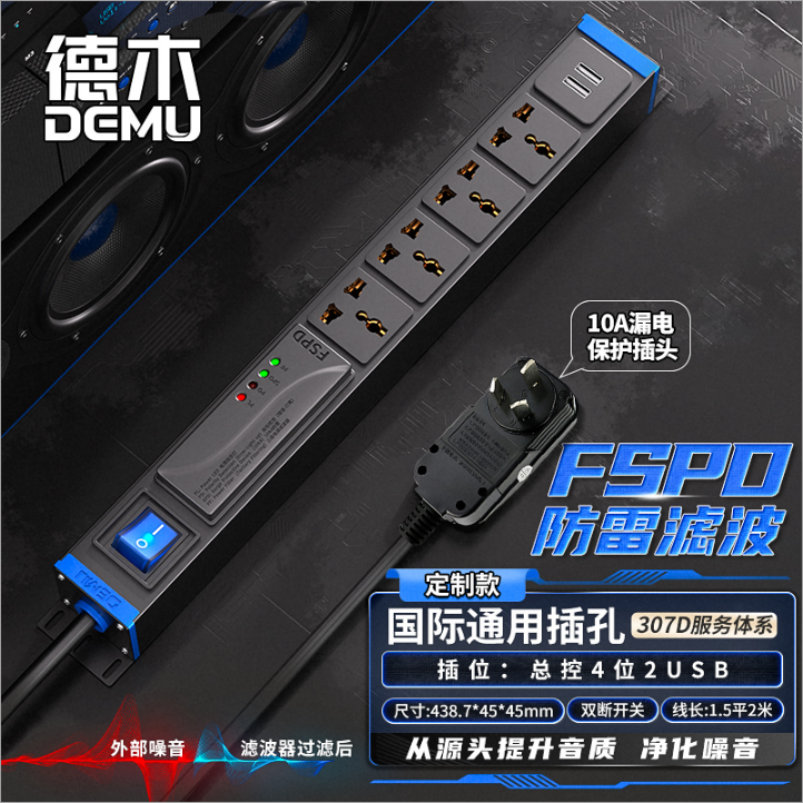 蓝色封板蓝色开关,1U非标尺寸:250V 10A输入,4位10A多用孔+1位2USB,配置F滤波模块+1位总控蓝色开关,2米1.5平线+10A南岛漏电保护插头
