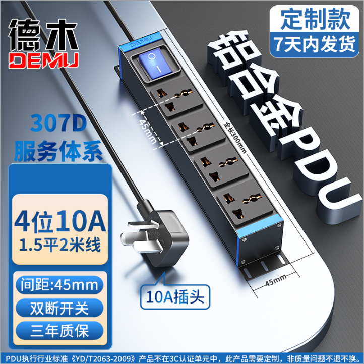 蓝色封板蓝色开关,1U非标尺寸:250V 10A输入,4位10A多用孔,1位蓝色双断开关,1.5平2米线+10A国标三脚插头