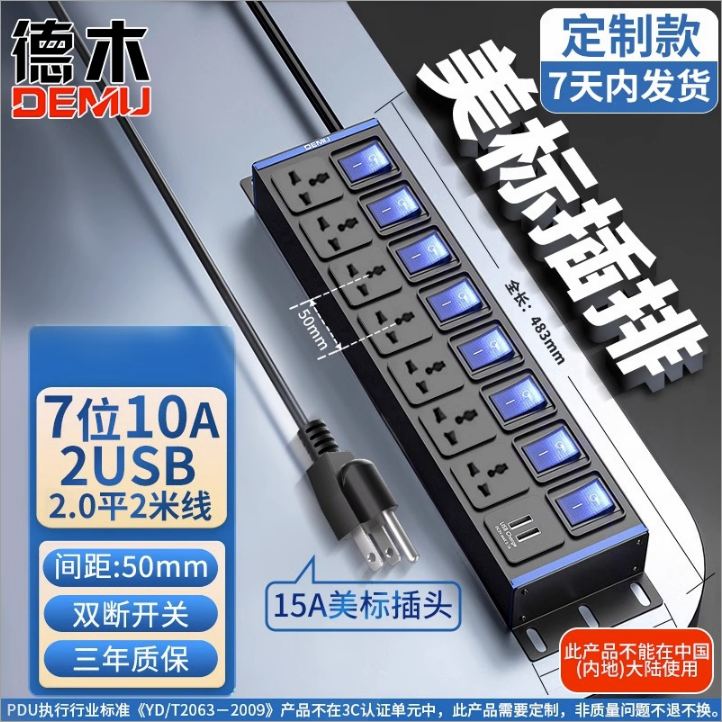 蓝色封板蓝色开关,2U标准尺寸:110V 15A输入,7位10A多用孔+1位2USB孔,8位蓝色双断开关,2平2米线+美标插头