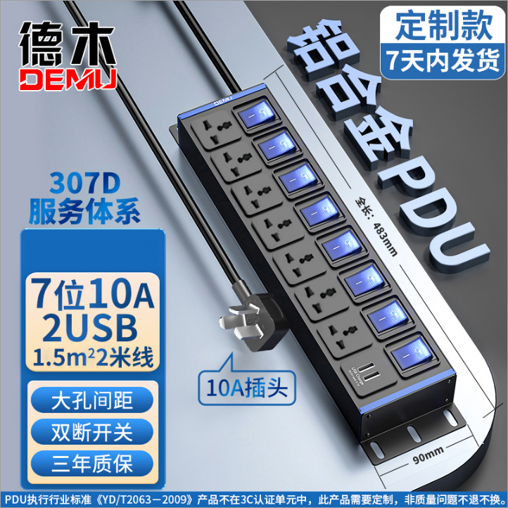 蓝色封板蓝色开关,2U标准尺寸:250V 10A输入,7位10A多用孔+1位2USB孔,8位蓝色双断开关,1.5平2米线+10A国标三脚插头