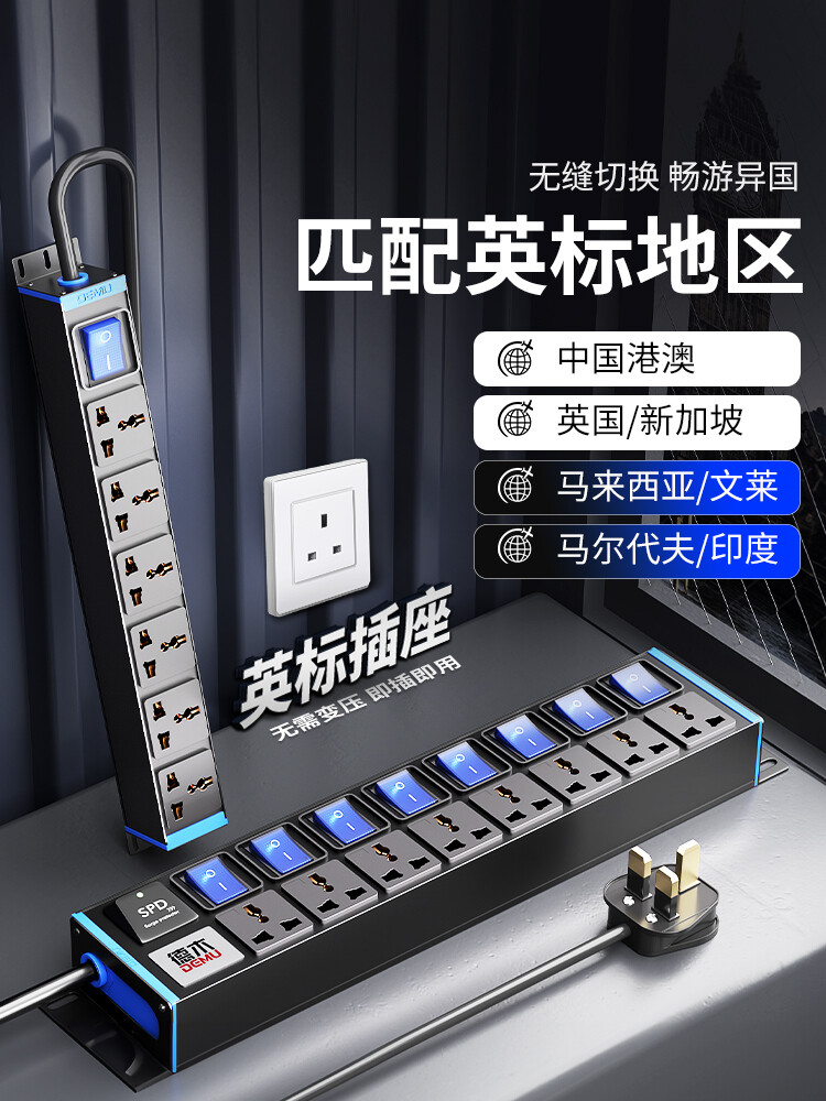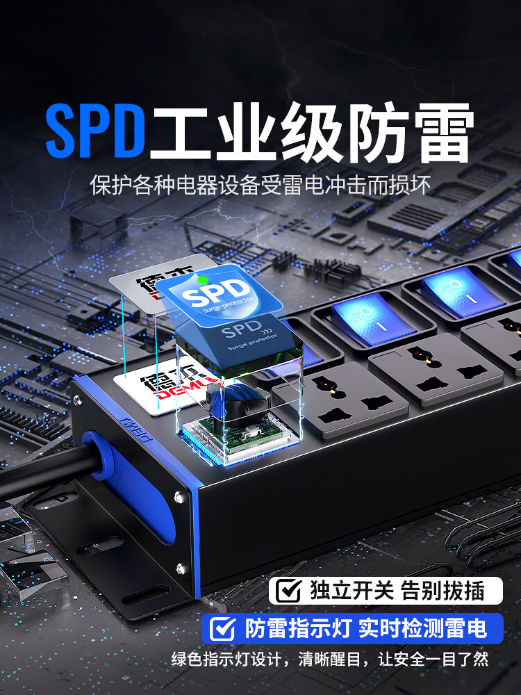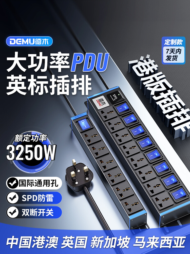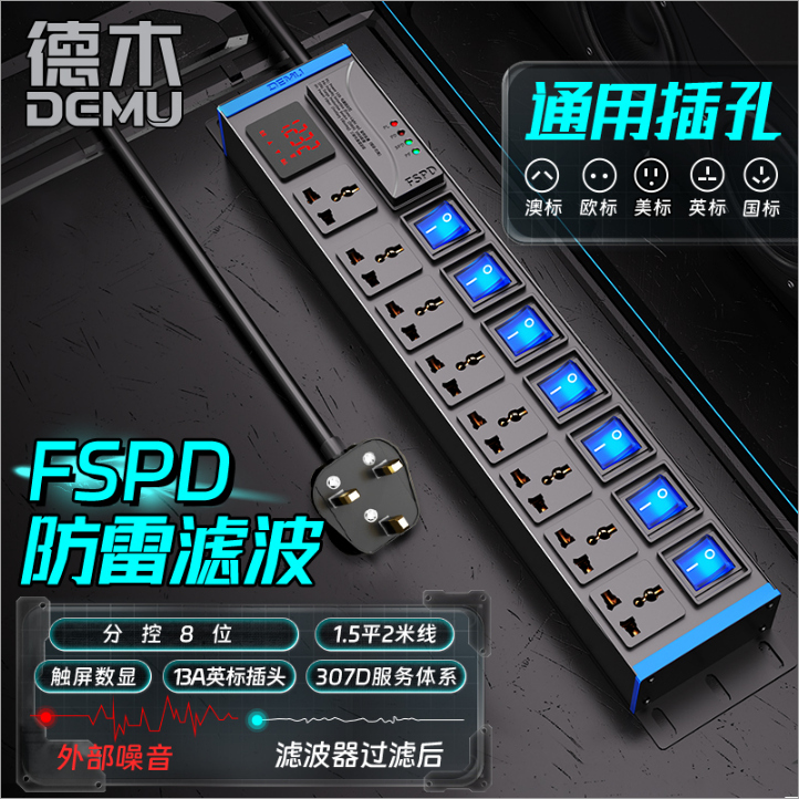 蓝色封板蓝色开关,2U标准尺寸:250V 10A输入,8位10A多用孔+7位蓝色双断开关,配置F滤波模块+计量,2米1.5平线+13A英标插头