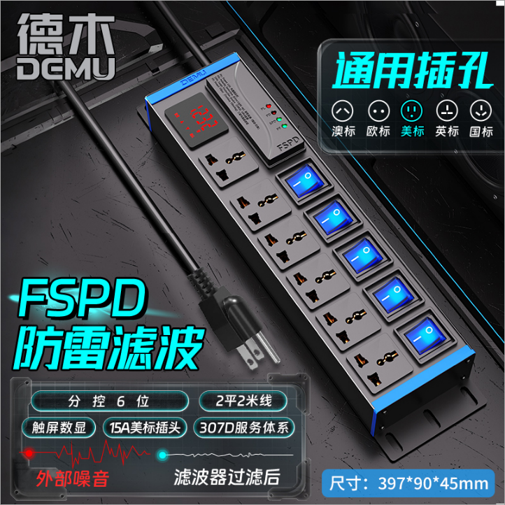 蓝色封板蓝色开关,2U非标尺寸:110V 10A输入,6位10A多用孔+5位蓝色双断开关,配置F滤波模块+计量,2米2平+15A美标插头