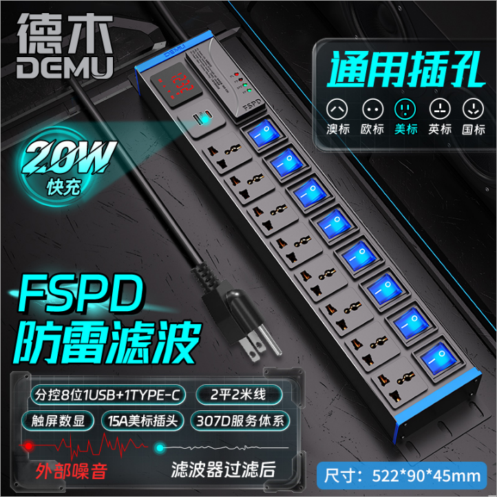 蓝色封板蓝色开关,2U非标尺寸:110V 10A输入,8位10A多用孔+8位蓝色双断开关,配置F滤波模块+计量+1位1U1C,2米2平+15A美标插头