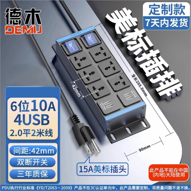 蓝色封板蓝色开关,2U非标尺寸:110V 15A输入,6位10A多用孔+2位2USB孔,2位蓝色双断开关,2平2米线+美标插头
