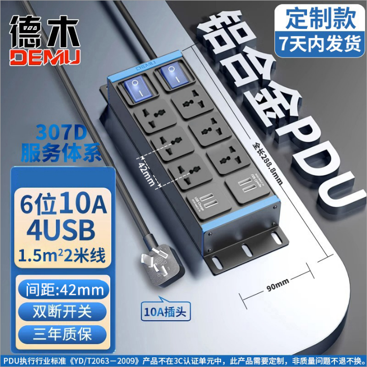 蓝色封板蓝色开关,2U非标尺寸:250V 10A输入,6位10A多用孔+2位2USB孔,2位蓝色双断开关,1.5平2米线+10A国标三脚插头