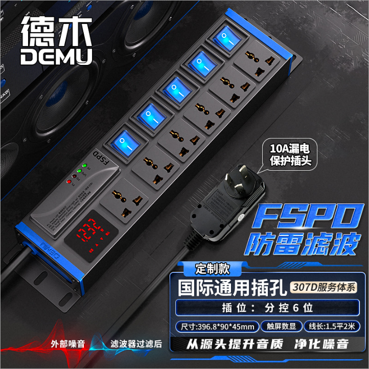 蓝色封板蓝色开关,2U非标尺寸:250V 10A输入,6位10A多用孔+5位蓝色双断开关,配置F滤波模块+计量,2米1.5平线+10A南岛漏电保护插头