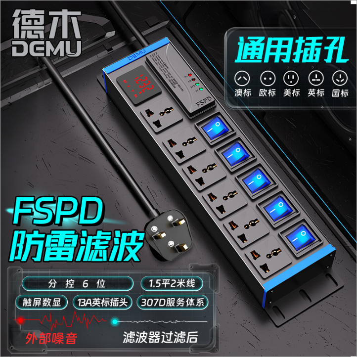 蓝色封板蓝色开关,2U非标尺寸:250V 10A输入,6位10A多用孔+5位蓝色双断开关,配置F滤波模块+计量,2米1.5平线+13A英标插头