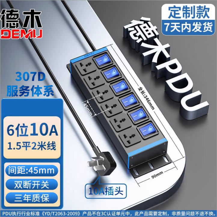 蓝色封板蓝色开关,2U非标尺寸:250V 10A输入,6位10A多用孔,6位蓝色双断开关,1.5平2米线+10A国标三脚插头