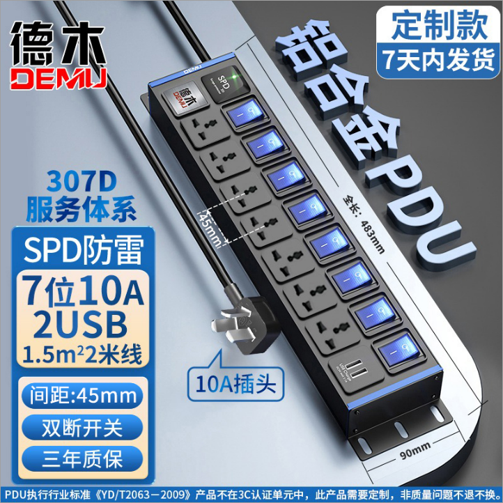 蓝色封板蓝色开关,2U非标尺寸:250V 10A输入,7位10A多用孔+1位2USB孔,防雷,8位蓝色双断开关,1.5平2米线+10A国标三脚插头
