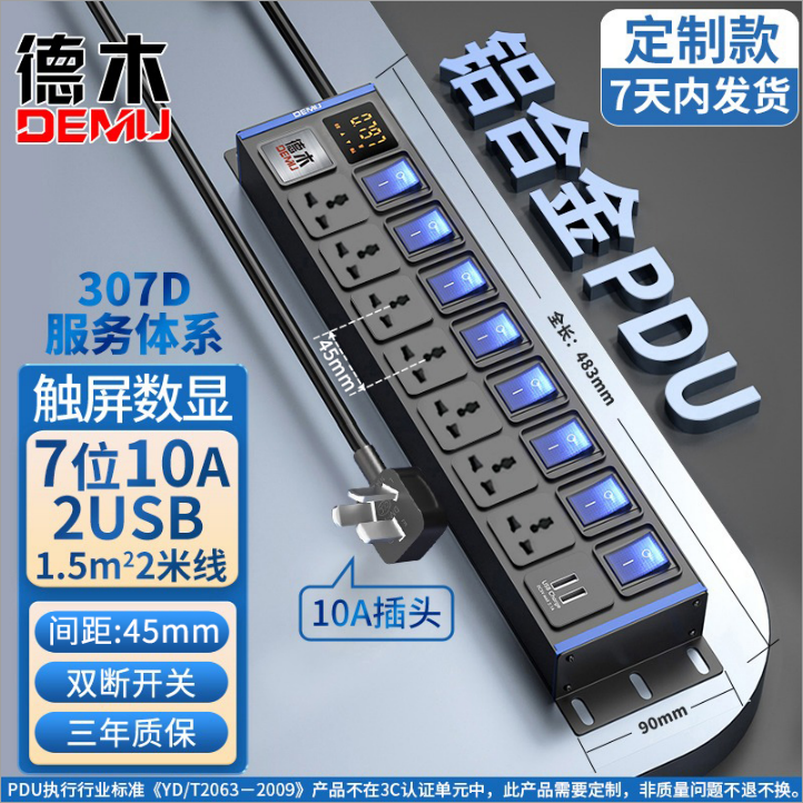 蓝色封板蓝色开关,2U非标尺寸:250V 10A输入,7位10A多用孔+1位2USB孔,计量,8位蓝色双断开关,1.5平2米线+10A国标三脚插头