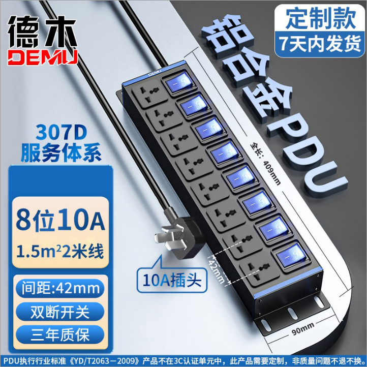 蓝色封板蓝色开关,2U非标尺寸:250V 10A输入,8位10A多用孔,8位蓝色双断开关,1.5平2米线+10A国标三脚插头