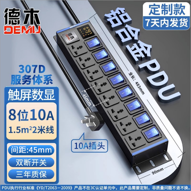 蓝色封板蓝色开关,2U非标尺寸:250V 10A输入,8位10A多用孔,计量,1.5平2米线+10A国标三脚插头
