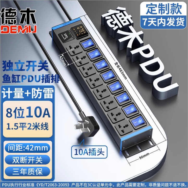 蓝色封板蓝色开关,2U非标尺寸:250V 10A输入,8位10A多用孔,计量+防雷,8位蓝色双断开关,1.5平2米线+10A国标三脚插头