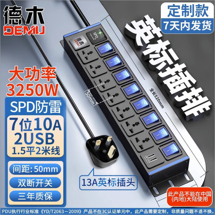 蓝色封板蓝色开关,2U非标尺寸:250V 13A输入,7位10A多用孔+1位2USB孔,防雷,8位蓝色双断开关,1.5平2米线+英标插头