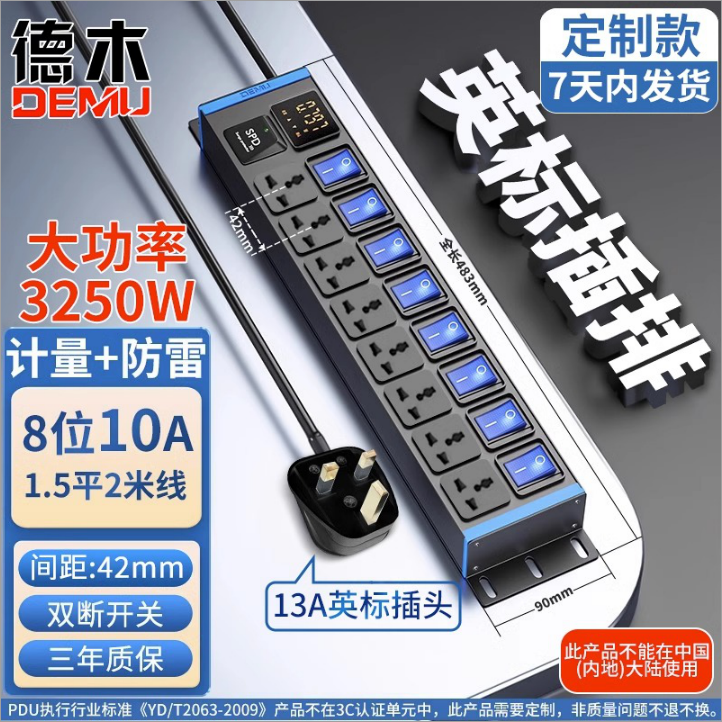 蓝色封板蓝色开关,2U非标尺寸:250V 13A输入,8位10A多用孔,计量+防雷,8位蓝色双断开关,1.5平2米线+英标插头