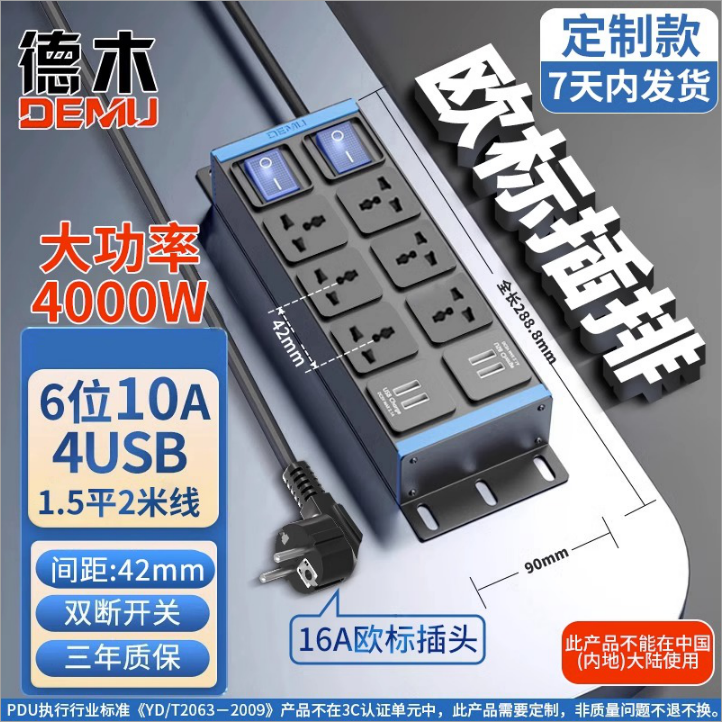 蓝色封板蓝色开关,2U非标尺寸:250V 16A输入,6位10A多用孔+2位2USB孔,2位蓝色双断开关,1.5平2米线+欧标插头