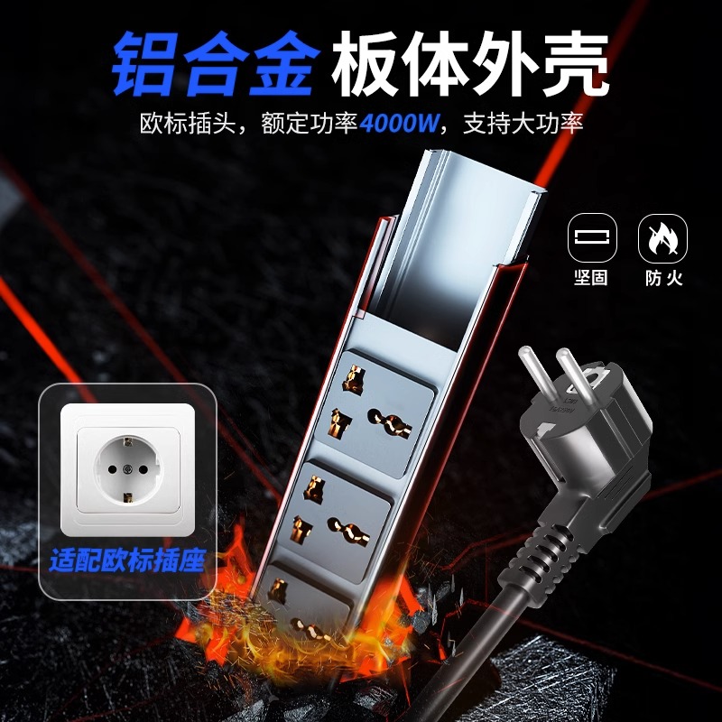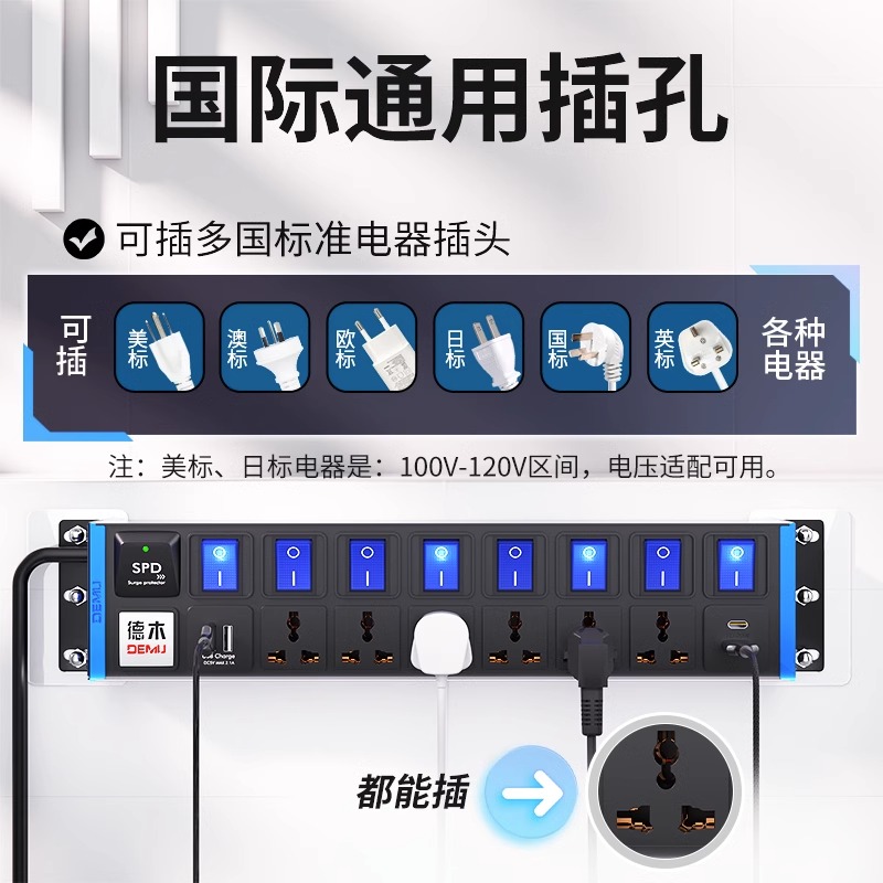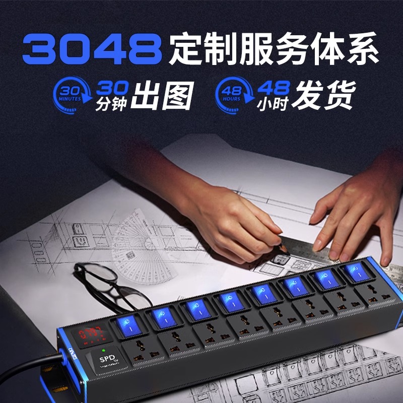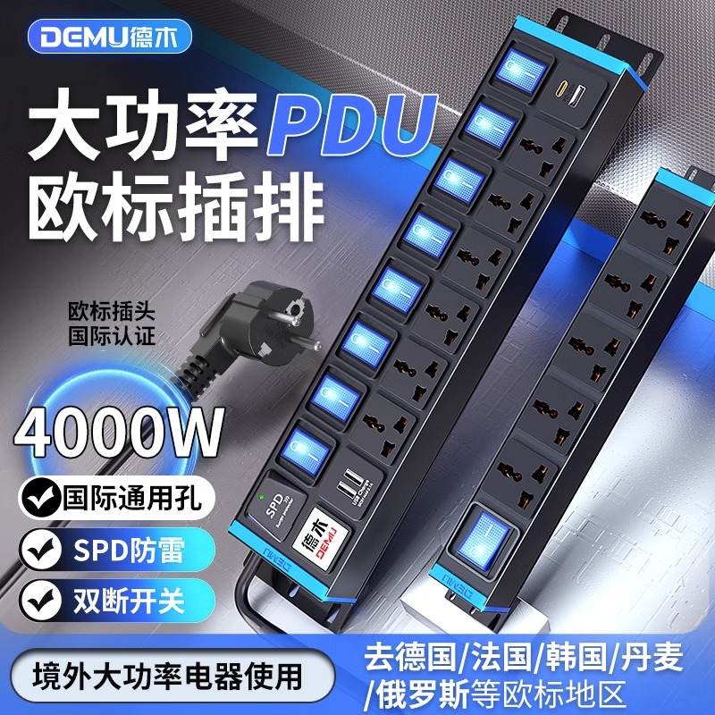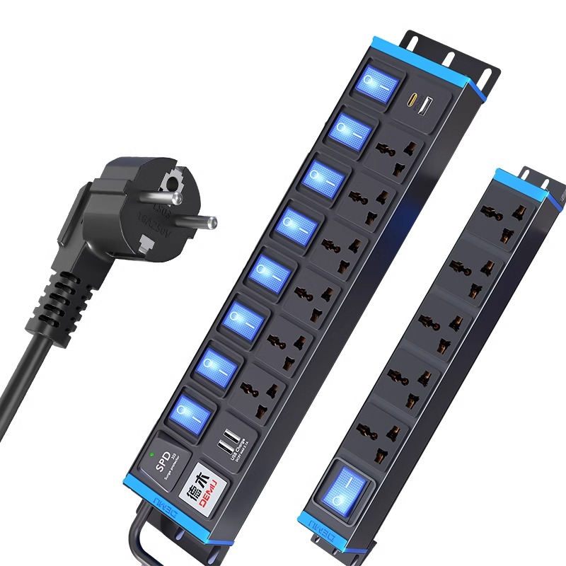 蓝色封板蓝色开关,2U非标尺寸:250V 16A输入,6位10A多用孔+2位2USB孔,8位蓝色双断开关,1.5平2米线+欧标插头