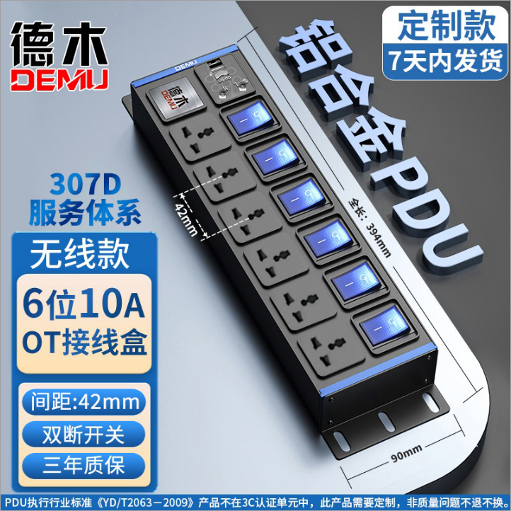 蓝色封板蓝色开关,2U非标尺寸:250V 16A输入,6位10A多用孔,6位蓝色双断开关,接线盒,无头无线