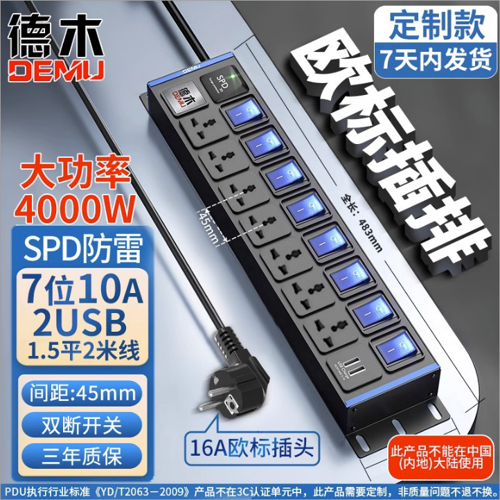 蓝色封板蓝色开关,2U非标尺寸:250V 16A输入,7位10A多用孔+1位2USB孔,防雷,8位蓝色双断开关,1.5平2米线+欧标插头