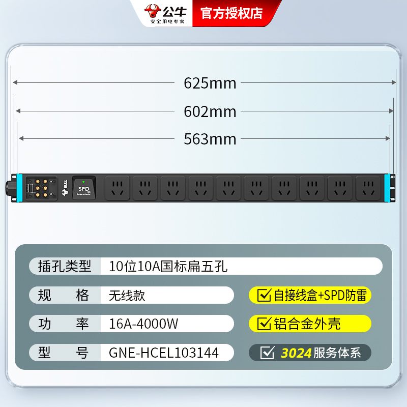 1U非标尺寸 左侧进线:250V 16A输入,10位10A国标扁五孔+防雷,小接线盒,无头无线