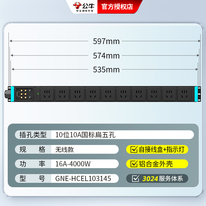 1U非标尺寸 左侧进线:250V 16A输入,10位10A国标扁五孔,指示灯+小接线盒,无头无线