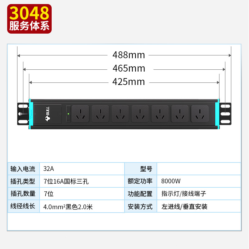 1.5U标准尺寸,黑色封板,左侧进线,接线端子;250V 32A输入,7位16A国标模块+灯,无线款
