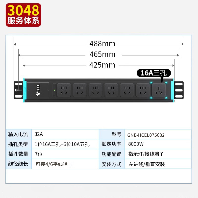 1.5U标准尺寸,黑色封板,左侧进线,接线端子;250V 32A输入,1位16A三扁孔+6位10A国标五扁孔模块+灯,无线款