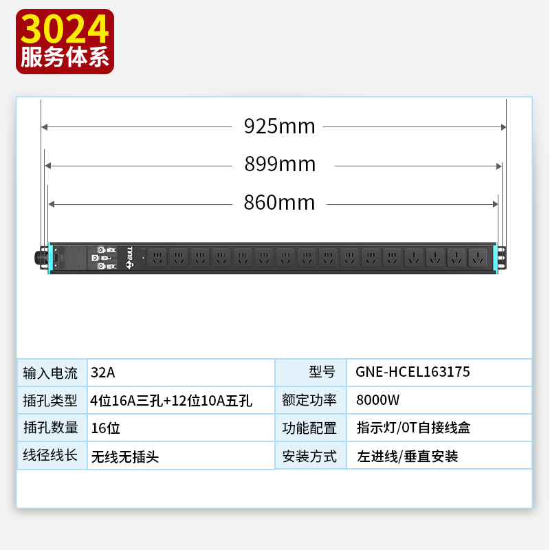 1.5U非标尺寸 左侧进线:250V 32A输入,4位16A国标三孔+12位10A国标扁五孔+接线盒
